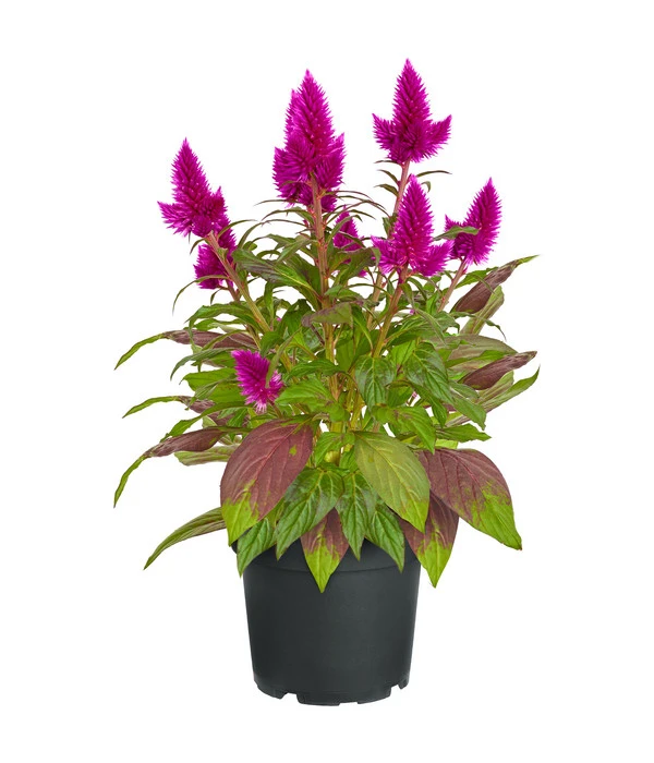 Diese exotische Pflanze aus der Familie der Fuchsschwanzgewächse trägt hierzulande den Namen Federbusch oder Hahnenkamm, doch vielen ist sie auch unter ihrem botanischem Namen Celosie bekannt. Beliebtheit hat die Beet- und Balkonpflanze vorallem aufgrund ihrer außergewöhnlichen Blütenform und -farbe erlangt. Die aufrecht wachsenden Blütenstände der Federbusch-Celosie ‚Venezuela‘, erwecken den Eindruck, als wären sie soeben wie Pinsel in einen Farbtopf mit dunklem Magenta gefallen. Diese federartigen Blüten leuchten über dem dunklen Laub und sind von April bis in den Herbst hinein ein wahrer Blickfang im Blumenbeet. Doch hiesige Winter wird die Celosie ‚Venezuela‘ nicht überstehen, deshalb wird sie meist als einjährige Gartenpflanze für die Schalen- oder Beetbepflanzung angeboten.