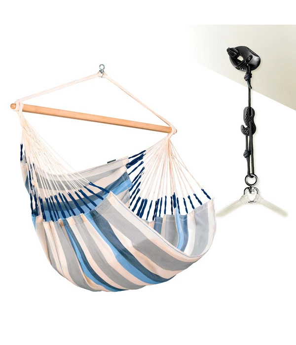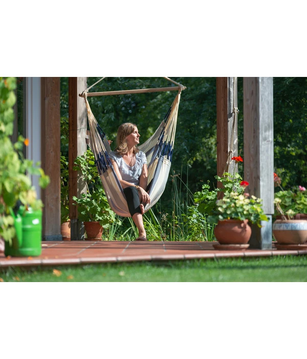 Sie lieben es neue Ideen aufzuspüren, gerade, wenn es um das Thema Entspannung auf der Terrasse oder im Garten geht? Dann darf dieser neue Relax-Trend bei Ihnen auf keinen Fall fehlen: ein La Siesta Hängestuhl Kingsize Domingo. In ihm fühlen Sie sich auch dann rundum wohl, wenn Sie sehr groß sind, denn die üppige Stofffläche bietet Ihnen jede Menge Platz für traumhafte Entspannung. Und die werden Sie in diesem trendigen Hängemöbel ganz sicher finden. Kuscheln Sie sich also einfach hinein, lehnen Sie sich gemütlich zurück und wenn Sie dann die Füße vom Boden heben schaukelt Sie Ihr La Siesta Hängestuhl Kingsize Domingo so sanft hin und her, dass Sie nicht anders können, als zutiefst zu entspannen. Dieses Gefühl wollen Sie unbedingt erleben – wann immer Ihnen zu Hause danach ist? Dann hängen Sie sich ganz schnell einen La Siesta Hängestuhl Kingsize Domingo auf!